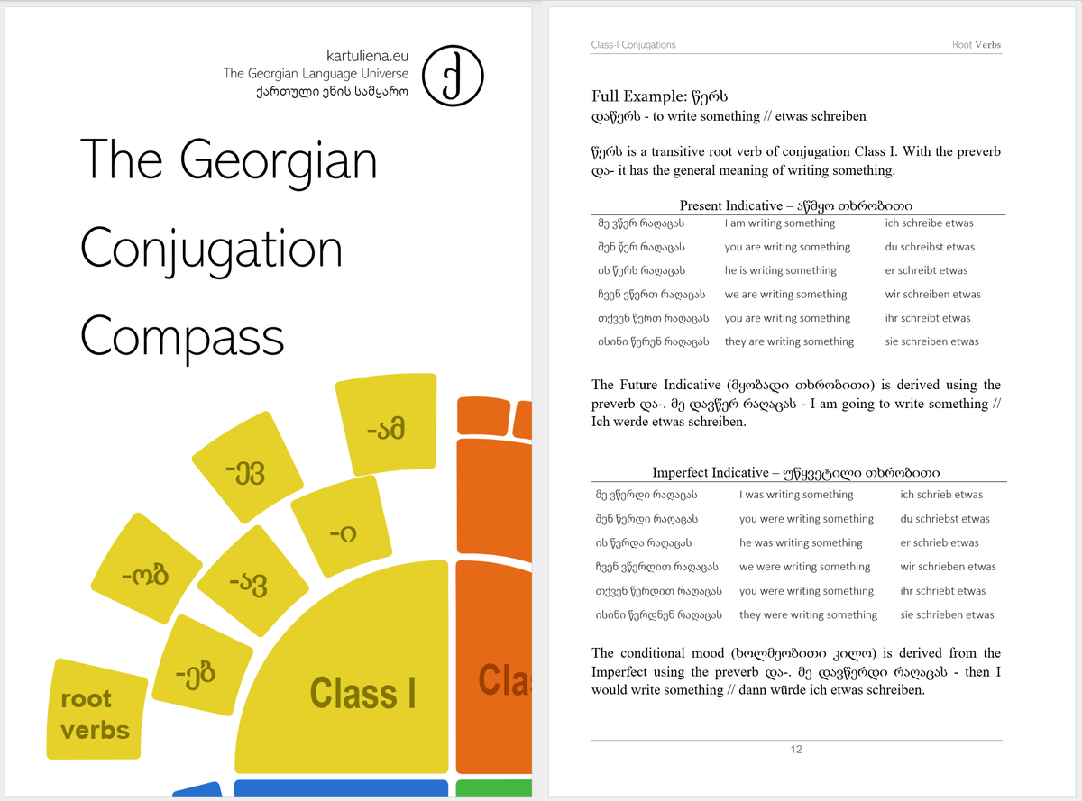 About the Georgian verbs it is important to know: The rules described in lessons 1-3 only fully apply to a certain number of verbs in Georgian, about two thirds of all 3,000-4,000 Georgian verbs (I counted: 66% or 330 of all 500+ verbs here on kartuliena.eu) - I call them the "Class-I Verbs", some of the more common Georgian textbooks have different names for them: transitive verbs, active verbs etc.
